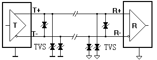 圖5給出了本采用TVS的保護(hù)電路。在發(fā)送端和接受端各采用3個(gè)TVS單元,分別對(duì)線路之間、線路對(duì)地之間的瞬態(tài)電壓干擾進(jìn)行抑制,消除了由于強(qiáng)電進(jìn)入而產(chǎn)生通訊口被燒毀的現(xiàn)象,從而有效的保證了整個(gè)通訊系統(tǒng)的安全運(yùn)行。