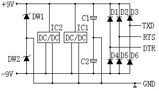 本裝置不需外接電源,其工作電源從RS232接口上竊取。如圖4所示:圖中TXD、RTS、DTR是RS232的輸出信號(hào),每根信號(hào)線可提供約9mA的輸出電源,通訊時(shí)其電壓在+10V和-10V之間跳變,通訊停止后其電壓極性不定,但開(kāi)機(jī)上電時(shí)全部為-10V。該三個(gè)信號(hào)經(jīng)D1~D6全波整流和C1、C2濾波后得到+9V和-9V直流電壓,若是開(kāi)機(jī)上電狀態(tài)則只有-9V電壓。IC1和IC2分別是負(fù)電壓到正電壓轉(zhuǎn)換器和正電壓到負(fù)電壓轉(zhuǎn)換器,將輸入電壓轉(zhuǎn)換極性并升壓,這樣無(wú)論TXD、RTS、DTR是什么極性都能在DW1和DW2端得到+9V和-9V的穩(wěn)定電壓。亦即不需靠軟件設(shè)置來(lái)得到工作電壓,確保適合所有軟件!其實(shí)只需以上任意一根信號(hào)線即可滿(mǎn)足要求。