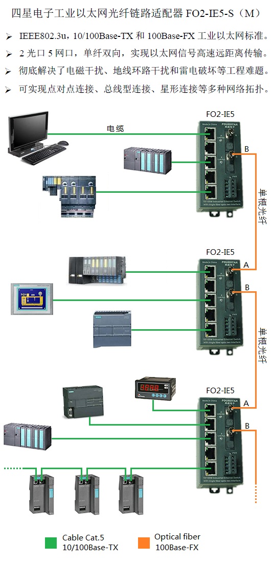 單纖2光5電工業(yè)以太網(wǎng)單模光纖鏈路適配器。2對單纖接口和5個RJ45以太網(wǎng)交換機電接口,符合IEEE802.3u,10/100Base-TX和100Base-FX工業(yè)以太網(wǎng)標準,網(wǎng)口速率10/100M自適應,光口速率100M,電源端口-網(wǎng)口-光纖端口全部隔離,光纖接頭標配ST接頭,適用光纖:單模9/125、10/125、8.3/125um,最大傳輸距離20km。DIN35mm標準導軌安裝或螺栓固定安裝,-20~+75℃工業(yè)級寬溫型。
