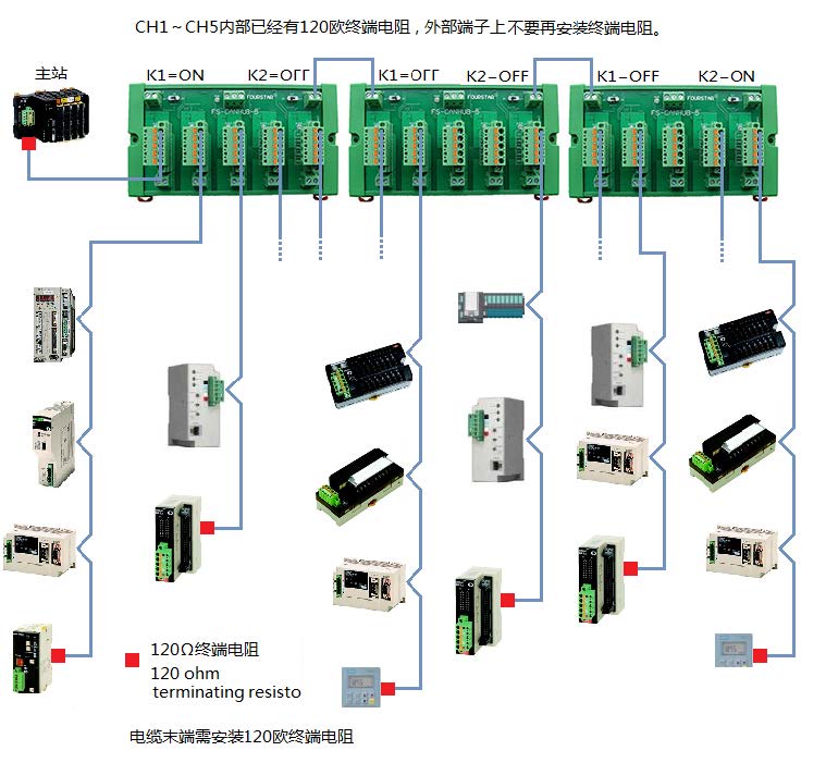 這種方案可以多出一個CAN口。擴(kuò)展總線CANH0、CANL0通常就近接主站設(shè)備,這個主站設(shè)備的CAN口需接一只120歐終端電阻,最后一臺FS-CANHUB-5右邊的開關(guān)撥到ON,除此之外的所有開關(guān)撥到OFF。如下圖所示,注意圖中開關(guān)的設(shè)置。