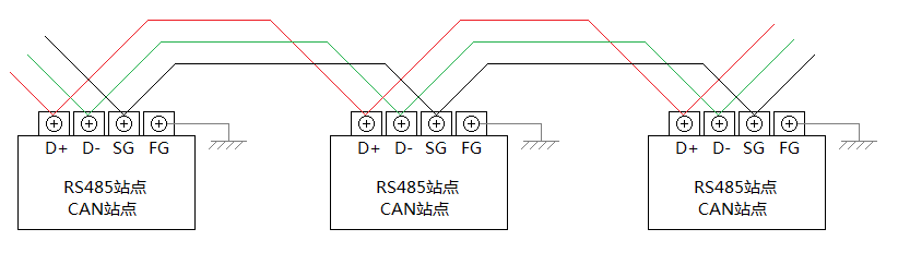 很多RS485和CAN總線產(chǎn)品還有一個信號地(通常符號為SG、DG)端子,按照相關(guān)標(biāo)準(zhǔn)上的表述是需要用一根導(dǎo)線將所有站點的信號地連通,使之成等電位,以免各站點地電位差太大損壞RS485或CAN器件。如圖5-1所示。