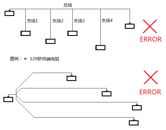 當(dāng)RS485或CAN信號在總線上傳輸時,會在支線中產(chǎn)生回波使得信號波形畸變,當(dāng)支線長度過長或者支線站點過多時尤其嚴(yán)重。常見的錯誤支線如圖3-2所示。