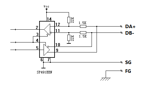 另一種結(jié)構(gòu)的RS485接口電路,如CC-Link,如圖2-9所示,這種RS485接口電路無需在設(shè)備外部設(shè)計上拉下拉電阻,直接并接120歐終端電阻即可,即使總線短路也不會使RS485接收器輸出長邏輯0給CPU,讀者可自行分析。