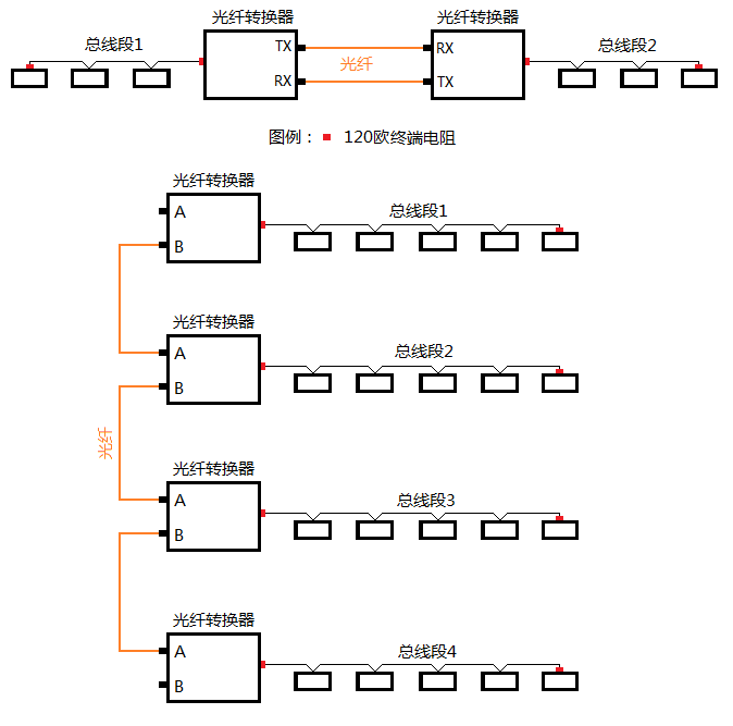 由于信號是雙向傳輸?shù)?,所以一段總線電纜的終端電阻是2個,需分別安裝在一段電纜的兩端。當(dāng)總線中安裝有中繼器、集線器、光纖轉(zhuǎn)換器等部件后,電纜就被這些部件分割成了幾段,每段電纜的兩端都須安裝終端電阻,以此類推,如圖2-1、圖2-2、圖2-3所示。