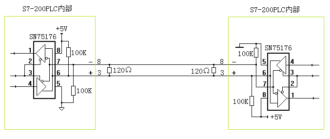 如圖2-5是S7-200PLC的RS485通信口簡化圖,為了保證總線上能夠掛接數(shù)十個RS485站點,PLC的RS485接口上只能設(shè)計兩個100K的弱上拉電阻和下拉電阻(也稱為偏置電阻,該電阻不能過小,否則節(jié)點掛多了時會把總線拉死?。?/span>