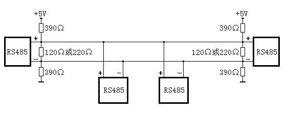 接入120歐終端電阻后,在RS485總線上產(chǎn)生偏置電壓為:5×0.12 /(100+100+0.12)=0.003V,眾所周知,RS485芯片的門限電壓為±0.2V,也就是說RS485輸入電壓在-0.2V~+0.2V之間時,其接收器的輸出是不確定的,如果接收器輸出為邏輯0 ,就會使CPU收到連續(xù)長0信號而無法正常通信。
