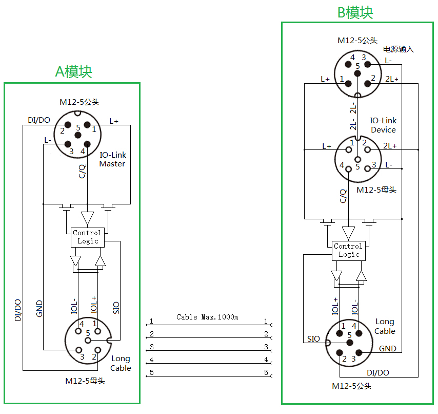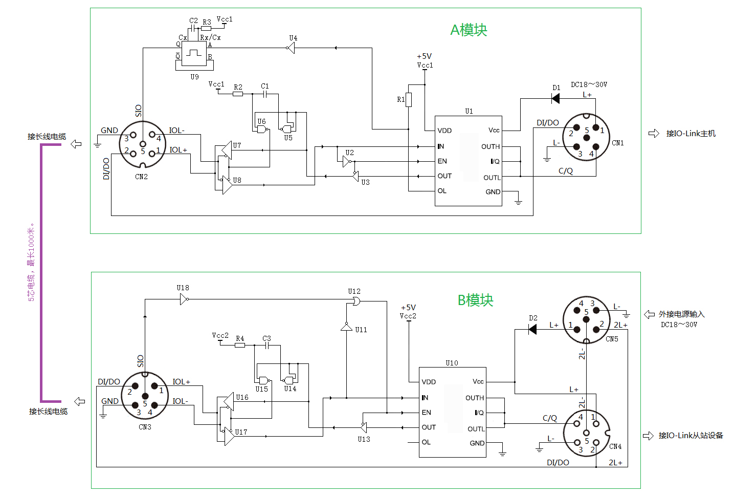 如圖2-1所示,本方案分為A模塊和B模塊,A模塊連接IO-Link主站,B模塊連接IO-Link HUB或IO-Link從站設(shè)備,用一根5芯電纜連接A模塊和B模塊。從圖中可看出,其基本原理是將IO-Link接口的單端雙向傳輸方式轉(zhuǎn)換為差分雙向傳輸,這樣就可大大的延長(zhǎng)IO-Link的傳輸距離。并能自適應(yīng)IO-Link的通訊速率COM1(4.8Kbps)、COM2(38.4Kbps)、COM3(230.4Kbps),A模塊和B模塊之間的電纜最大長(zhǎng)度可達(dá)1000米。